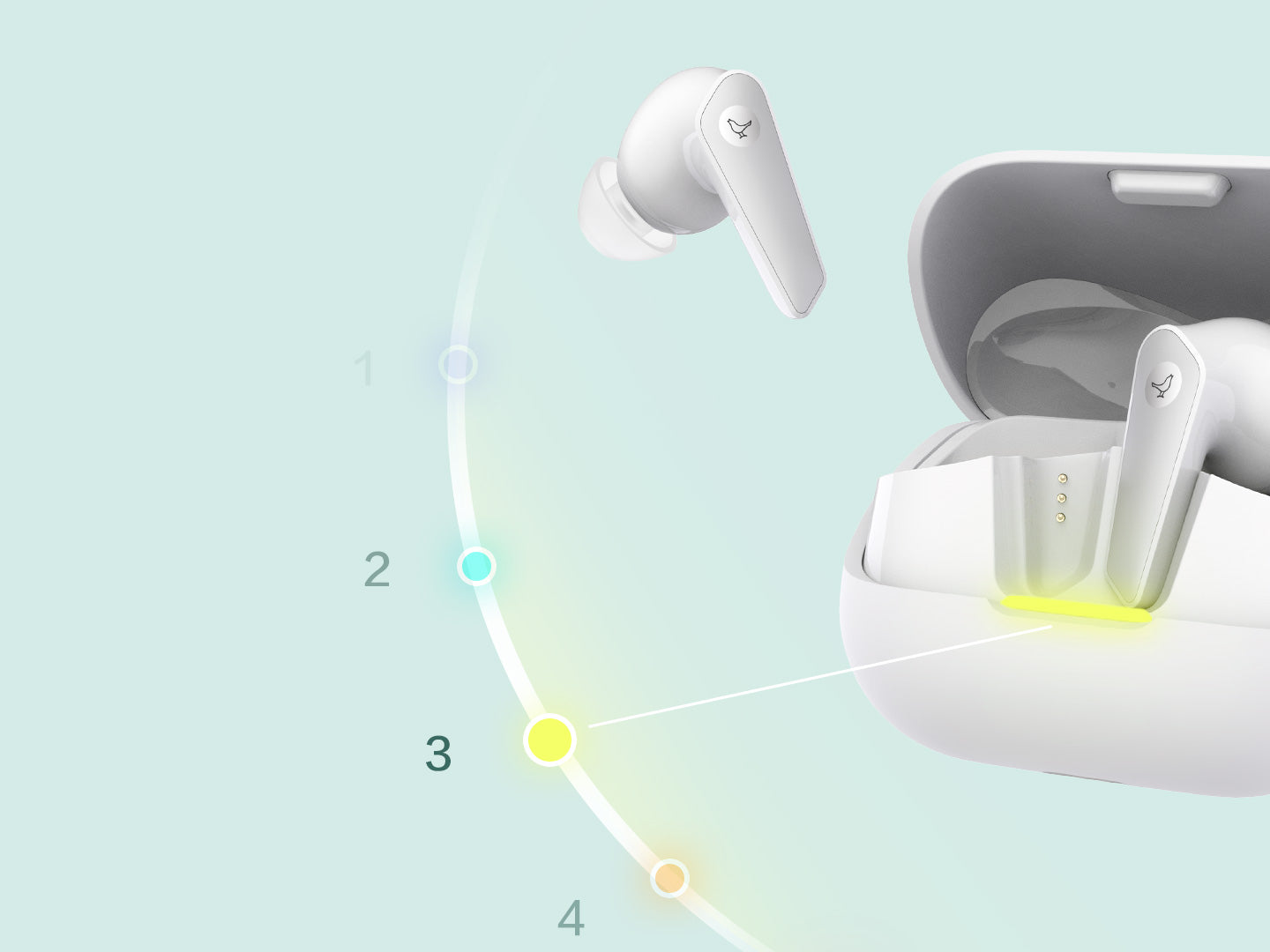 You can connect the AIR+3 to up to 5 devices and effortlessly switch between them by tapping the earbuds. Shuffle between your smartphone, tablet, and notebook. Each device is assigned a color on the front LED strip (configurable in the app).